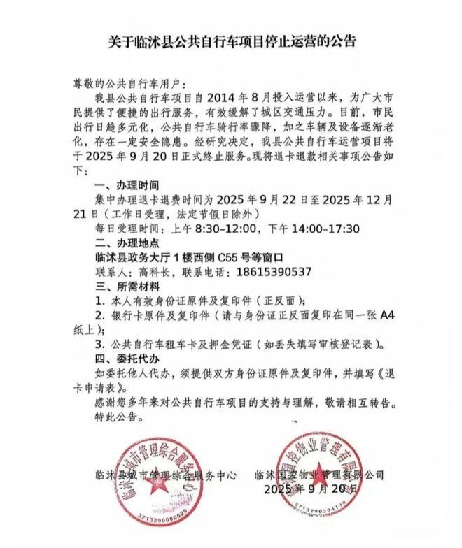 9月20日,临沂市临沭县发布了《关于临沭县公共自行车项目停止运营的公告》,这项自2014年8月投入运营的公共项目正式终止服务。